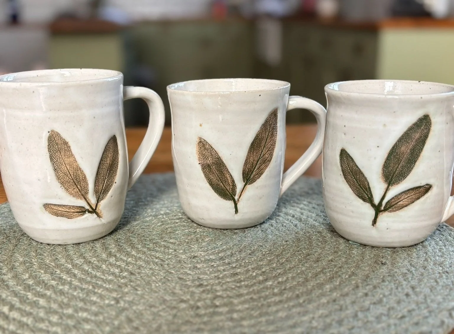 I actually thought of the above song by The Cure from 1992 when I opened my kiln this morning. I am crazy about a new (for me) decorating method that uses fresh Salvia leaves pressed into newly thrown mugs. This group was the second set I’ve made, trying to perfect the technique of coloring the veins in the leaves with underglaze or oxides and then covering the leaves with wax before dipping the mugs in glaze. It is such a pretty and organic motif, and I will definitely be using it on some other objects.